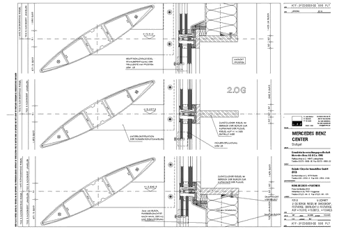Mercedes-Benz Center Leitdetail: V-Schnitt: P/R Konstruktion, Riegel mit Shadowbox-paneel, Oberlicht und Festverglasung